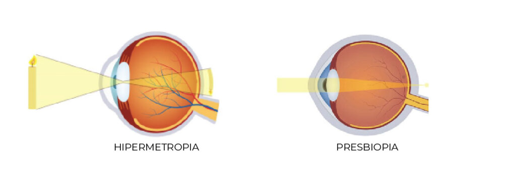 Hipermetropia: é um erro refrativo presente desde o nascimento, no qual o olho é “curto” ou a córnea tem menos poder de foco. Pode causar dificuldade para perto e, em graus mais altos, também para longe. A presbiopia pode somar-se à hipermetropia, exigindo correção específica em cada caso.